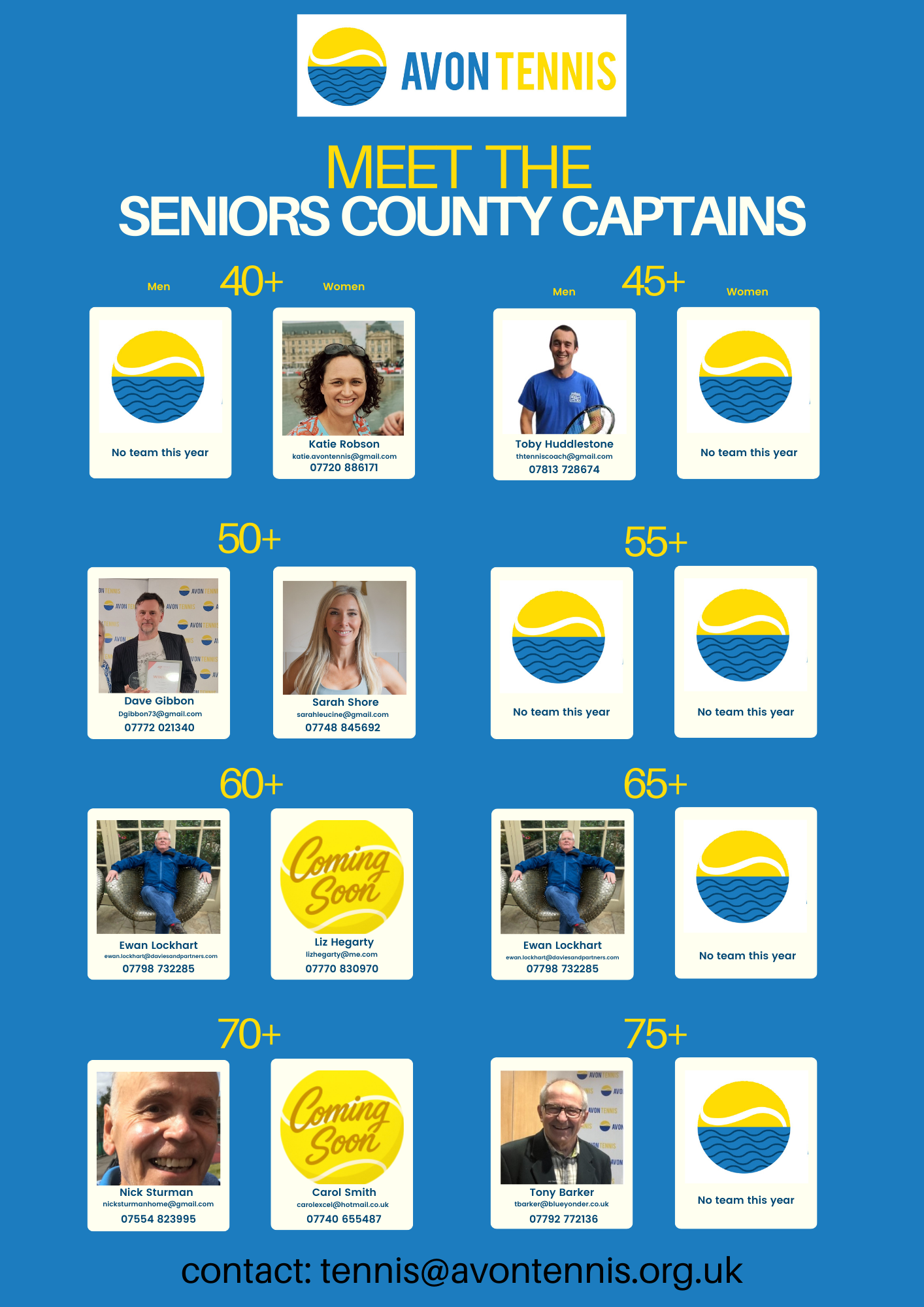 For those interested in representing Avon Tennis in inter-county competitions, there are plenty of opportunities to get involved. If you’d like to learn more, please reach out to the Avon Tennis Seniors Age Group Captains for 2026, whose contact details are as follows: